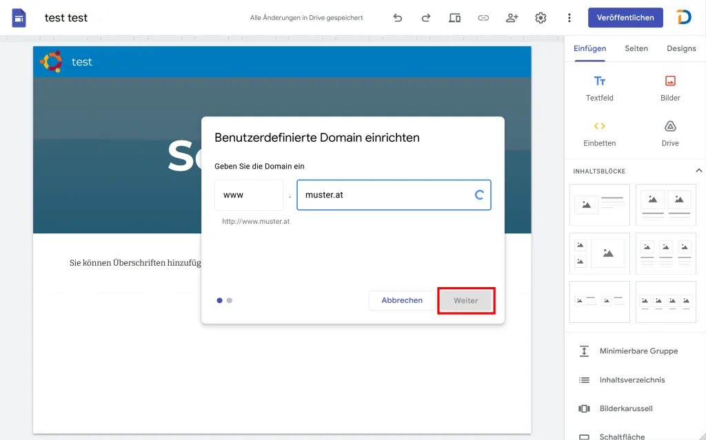Im letzten Schritt wechseln Sie zurück zu Google Sites und verknüpfen die Domain. Da Sie den CNAME-Eintrag bereits erstellt haben, sind keine weiteren Schritte erforderlich.